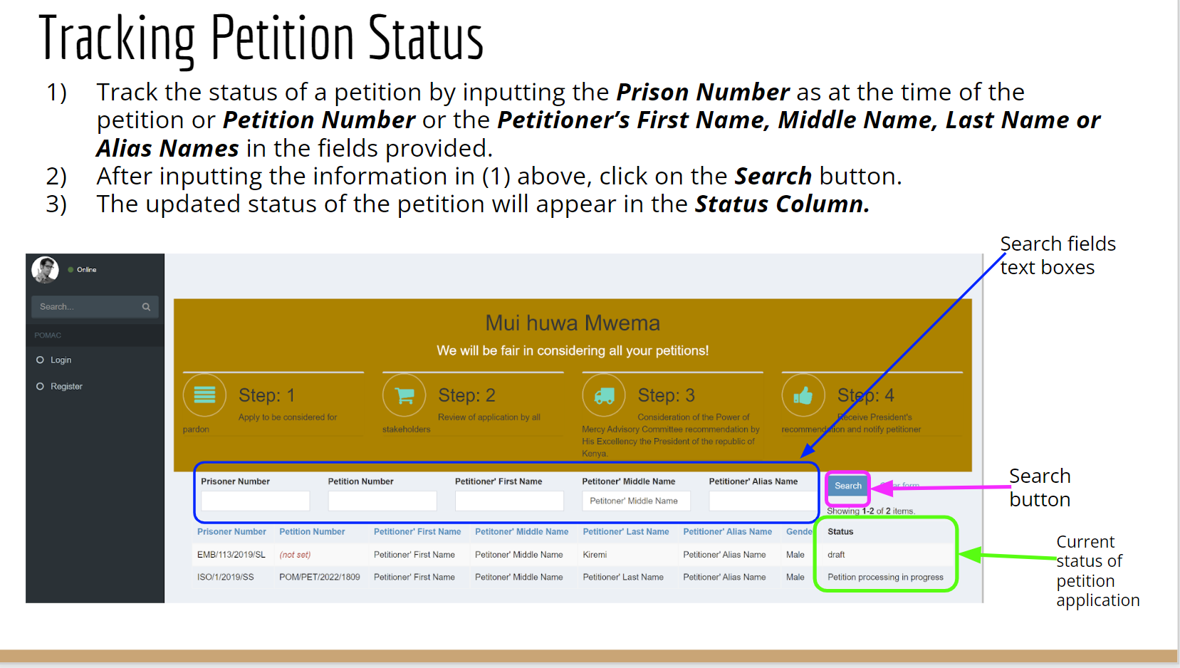 A petitioner may apply individually or through an agent and/or advocate in writing or electronically to POMAC.